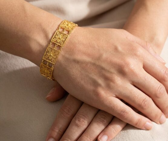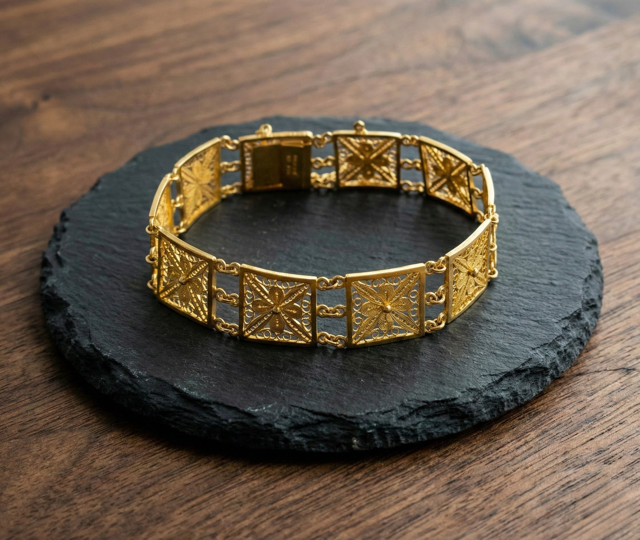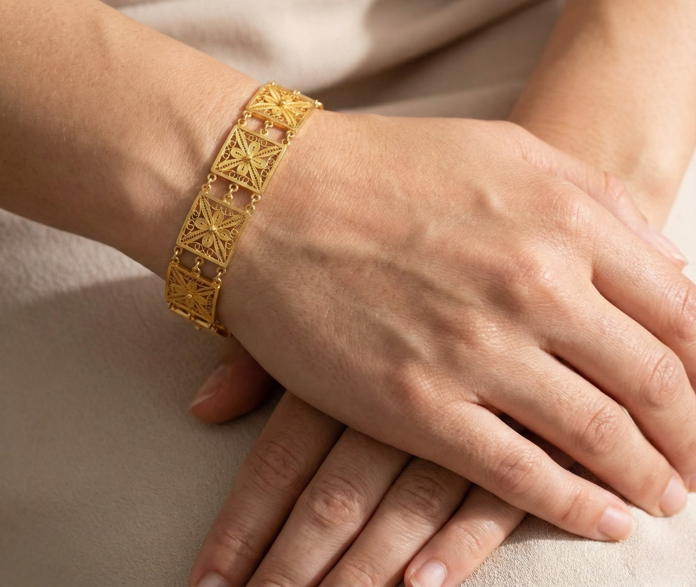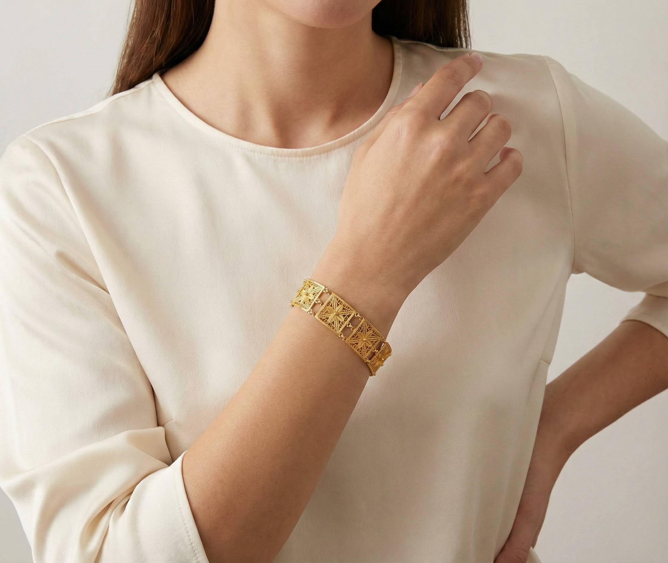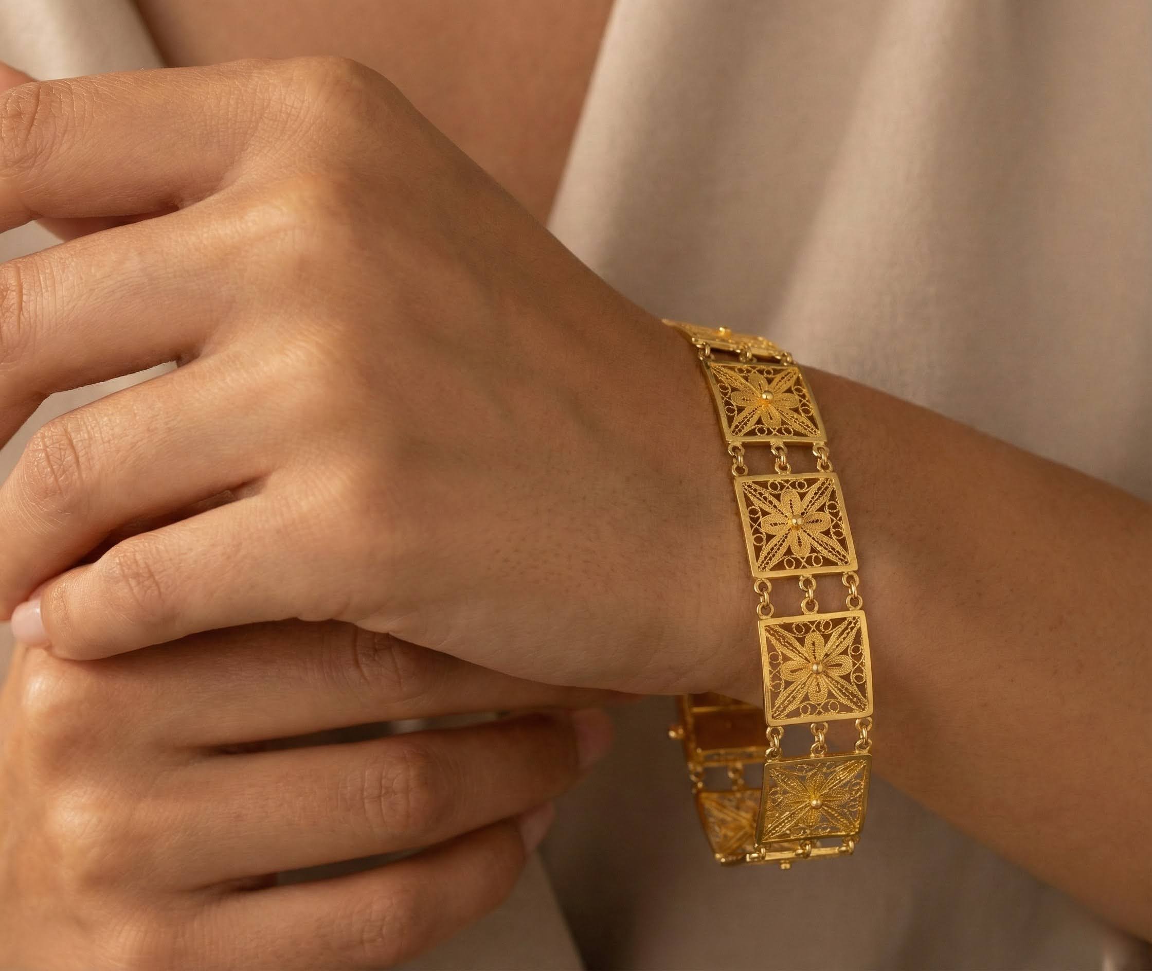 De 21 karaat gouden filigrain armband is een prachtig sieraad om te dragen.
