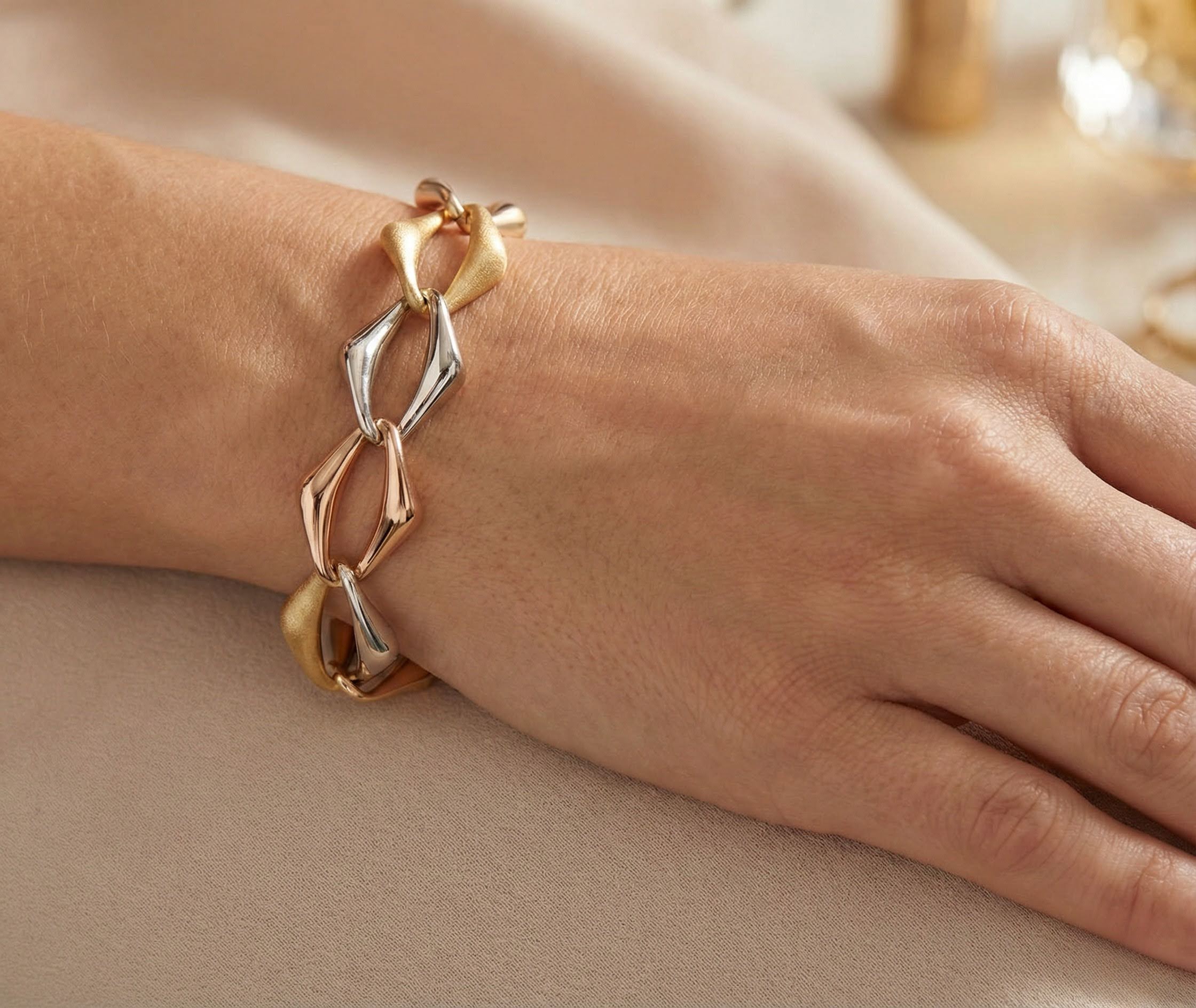 Draagt u graag schakelarmbanden? Bestel uw 14 karaat Christian tricolor gouden armband direct via atelierchristian.nl!