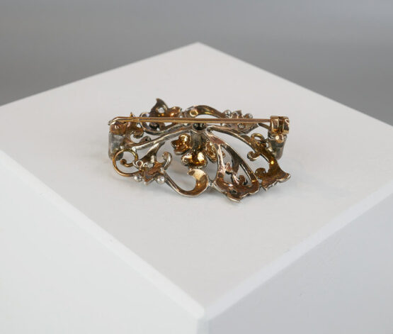De roosdiamant in de broche is het toonbeeld van een siersteen: een prachtig juweel om uw hals te dragen. Roosdiamant is zeldzaam omdat het tegenwoordig bijna niet meer wordt vervaardigd en gebruikt. Onze diamanten zijn gekeurd door de Meester in de Goudsmeden op de slijpvorm, zuiverheid, kleur en het karaatgewicht. Dit sieraad valt direct op vanwege zijn unieke ontwerp en schitterende roosdiamant.