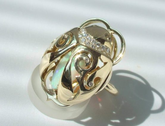 Het lichaam van de Scarabee is bezet met een schitterende opaal. Opaal is een edelsteen dat bijzonder is vanwege de regenboog-kleurige schittering, die verander met de gezichtshoek. Er zijn drie soorten opaal: de glinsterende edelopaal, de geelrode vuuropaal en gewone opaal. Deze ring s bezet met een edelopaal. Opaal is sinds de oudsher het zinnenbeeld van trouw en hoop. Bij geronde slijpvormen komt het kleurenspel het beste tot uitdrukking.