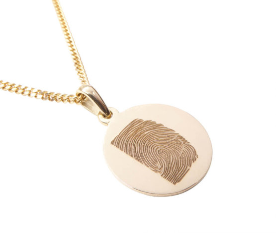 Deze geel gouden fingerprint hanger is een prachtig sieraad waar de vingerprint van een persoon in is verwerkt.