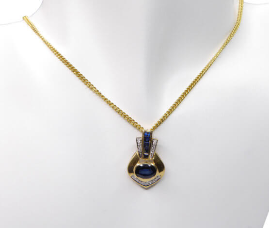Deze gouden collier met saffier hanger is een prachtig sieraad om te dragen. Deze hanger valt direct op vanwege het mooie ontwerp.
