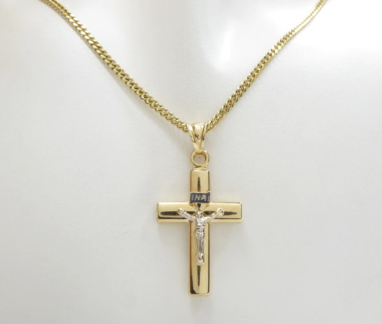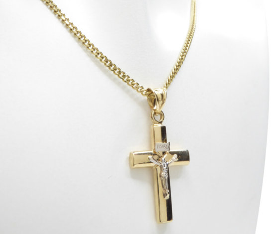 Deze geel en wit gouden kruis met korpus is een prachtige sieraad om te dragen.