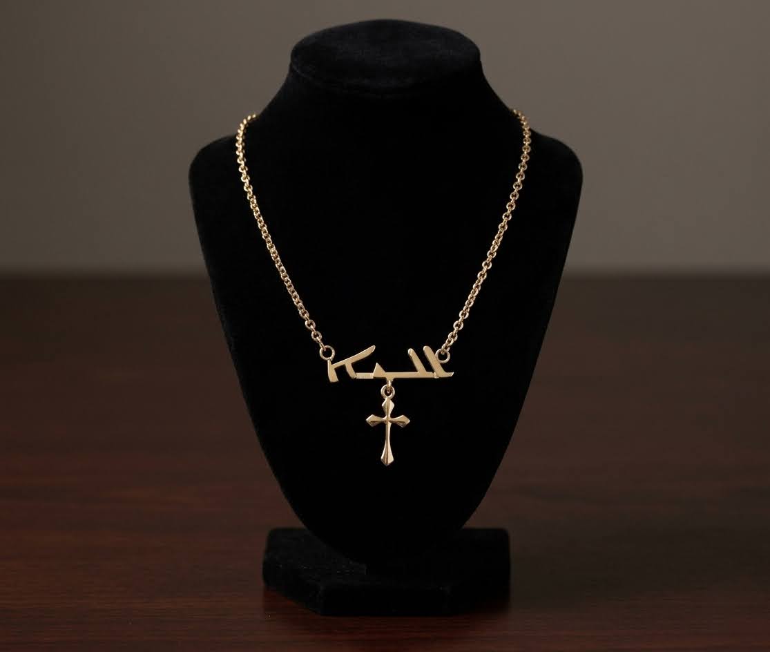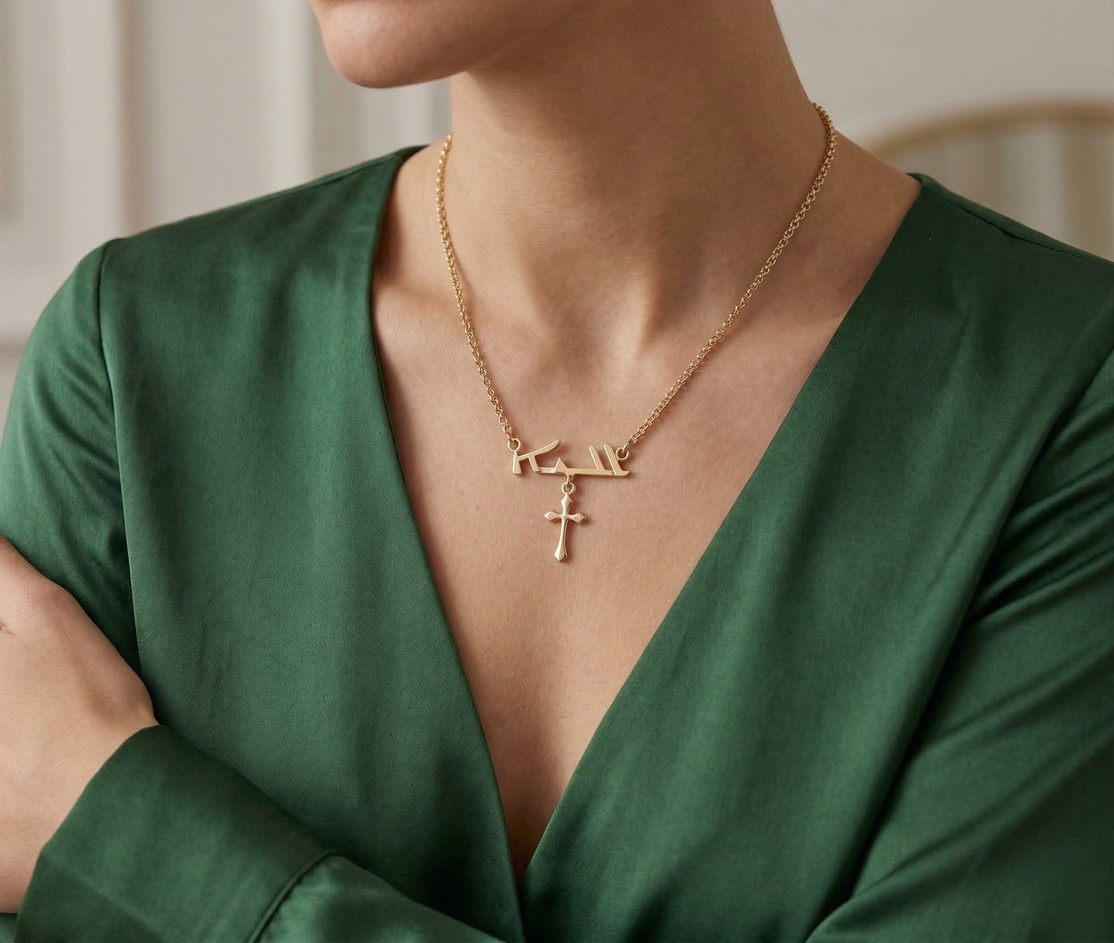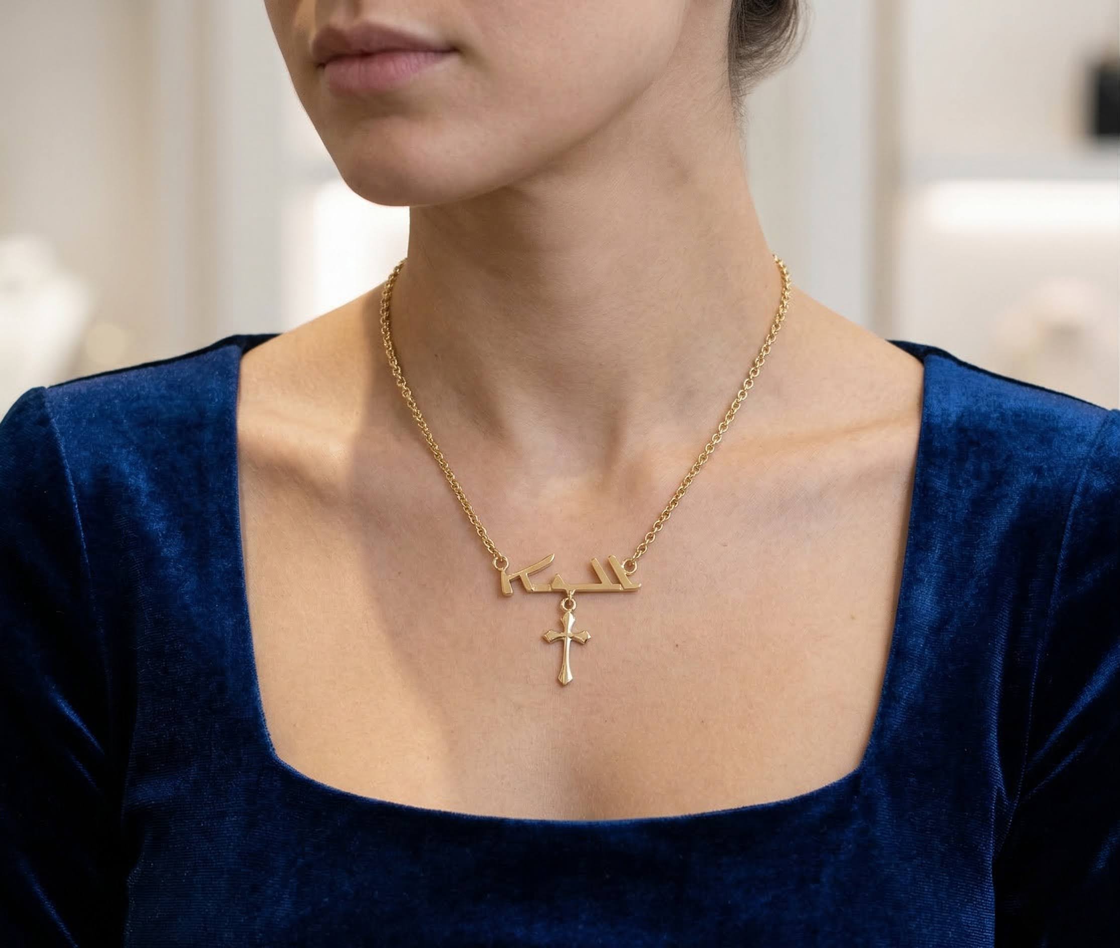 Deze gouden Arabische naam met kruis hanger is een prachtig sieraad om te dragen.