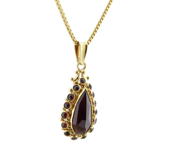 De gouden hanger met granaat is een prachtig sieraad om te dragen.