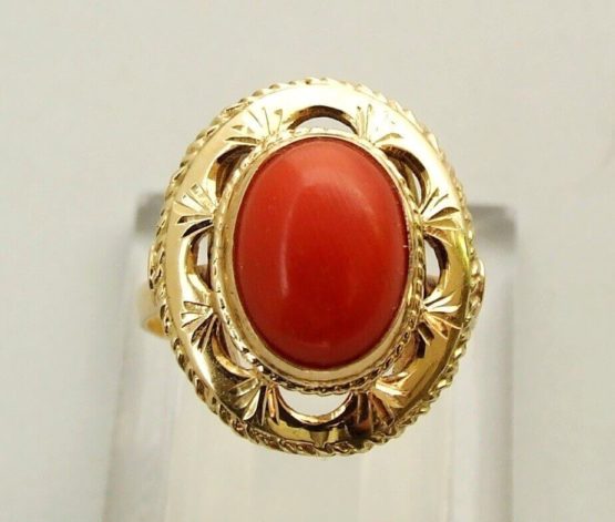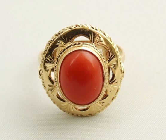 14 karaat geel gouden ring met bloedkoraal