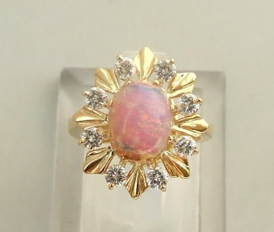 Opaal is een edelsteen dat bijzonder is vanwege de regenboogkleurige schittering, die verander met de gezichtshoek. Er zijn drie soorten opaal: de glinsterende edelopaal, de geelrode vuuropaal en gewone opaal. Deze ring is bezet met edelopalen. Opaal is sinds de oudsher het zinnenbeeld van trouw en hoop. Bij geronde slijpvormen komt het kleurenspel het beste tot uitdrukking.