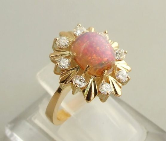 De geel gouden ring met opaal en diamant is een prachtig sieraad om te dragen. Dit sieraad springt direct in het oog.