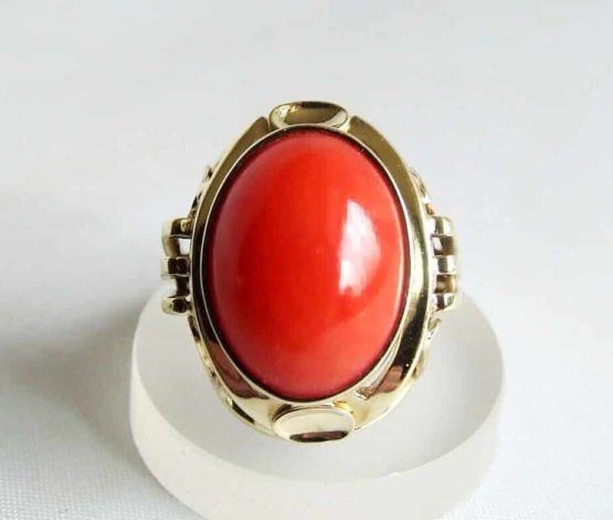 Bloedkoralen sieraden zijn bijzonder en zeldzaam. Het bloedkoraal in deze ring is tot op wel 300 meter diepte gewonnen. Van de verschillende edelkoralen is bloedkoraal het meest gewild. Bloedkoraal kan een felrode kleur hebben, maar ook rood-oranje zijn. Bloedkoraal is zeldzaam omdat het niet meer uit de zee mag worden gewonnen. Er is nog maar heel weinig mooi bloedkoraal over. Ieder sieraad met bloedkoraal is waardevol.