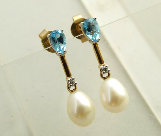 Gouden oorbellen met topaas, diamant en parel