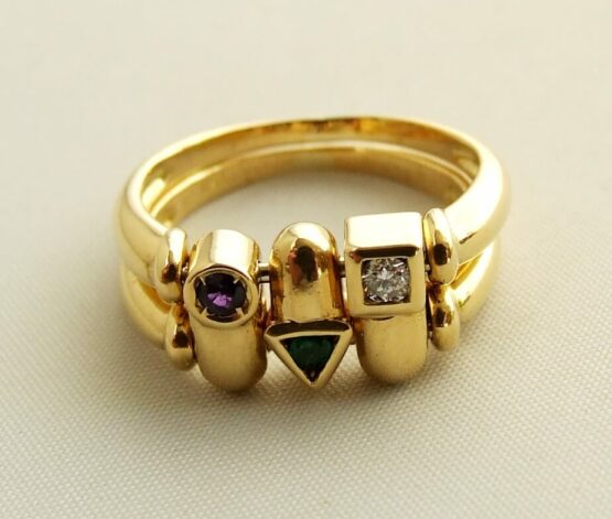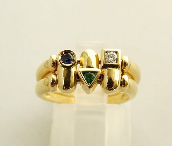 Deze 18 karaat gouden ring met diamant, smaragd en saffier is een prachtig sieraad dat direct in het oog springt vanwege de schitterende edelstenen.