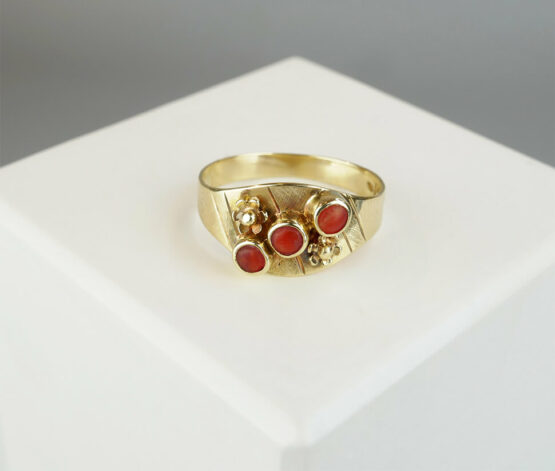 Deze Christian goud ring met 3 bloedkoralen is een prachtig sieraad om te dragen.