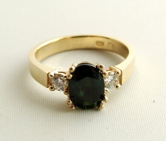 Houdt u van groene saffier? Saffier voegt als schitterende edelsteen een waardige uitstraling toe aan de drager. Dit donkergroene edelgesteente is een kostbare edelsteen die in de natuur gevonden wordt. Ieder saffier heeft zijn eigen fonkeling en kleur waardoor geen enkele saffier hetzelfde is. Als juweel staat saffier symbool voor rijkdom. Deze geel gouden ring met echte, natuurlijke saffier is een prachtig sieraad. Bekijk nu onze uitgebreide collectie saffieren sieraden.