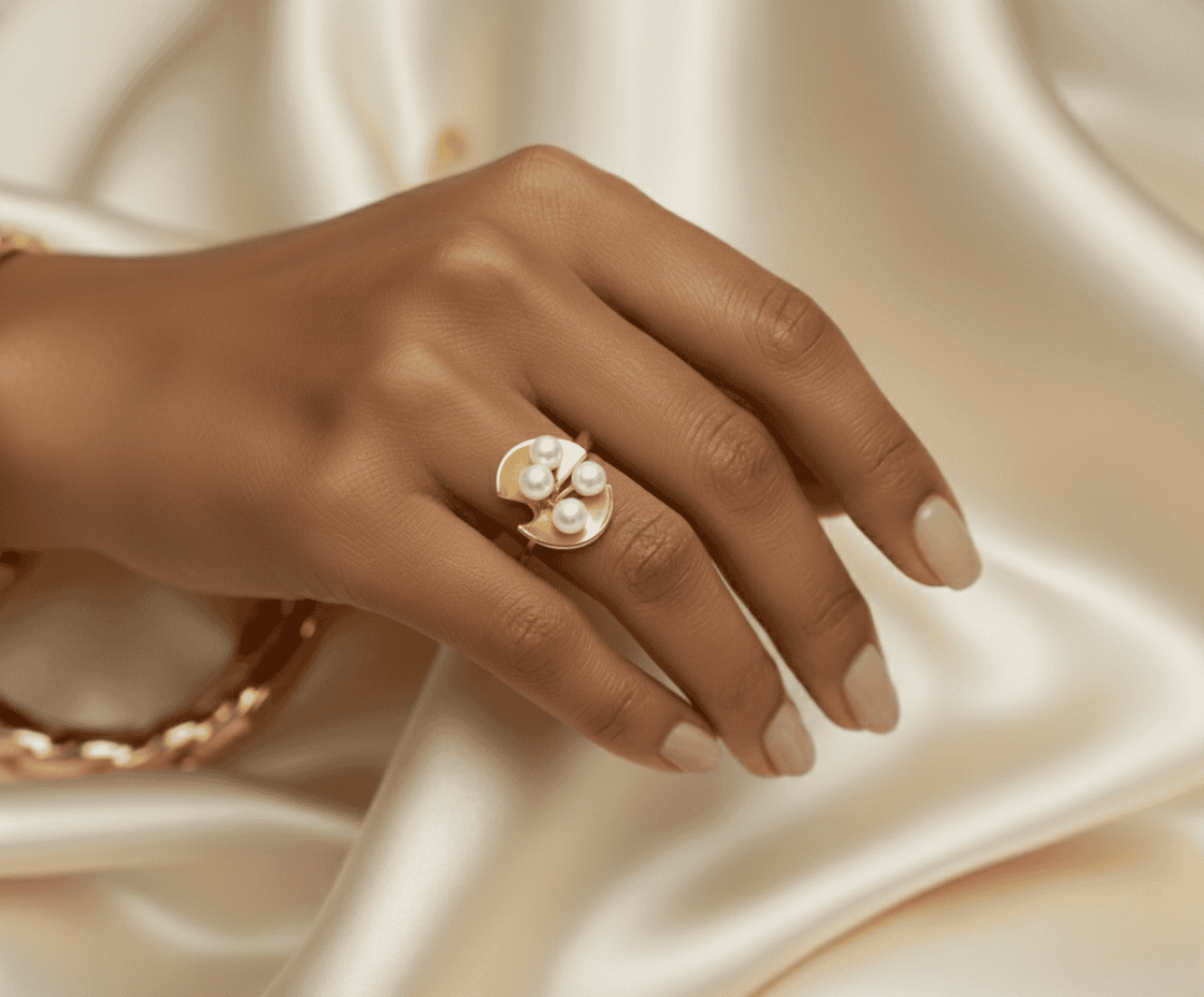 Bestel uw geel gouden ring met 4 parels direct via atelierchristian.nl!