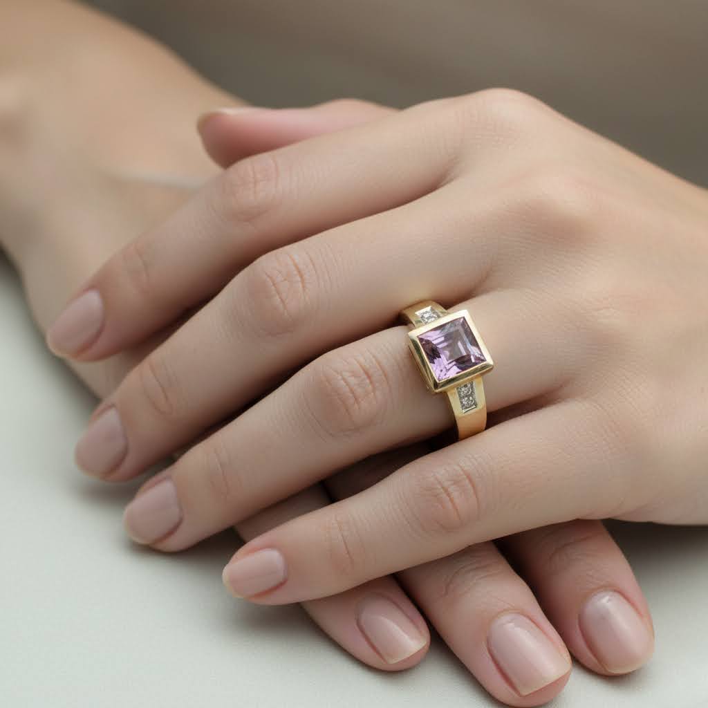 De geel gouden ring met amethyst is een prachtig sieraad om te dragen. De amethyst en diamanten in de ring doen de drager schitteren.