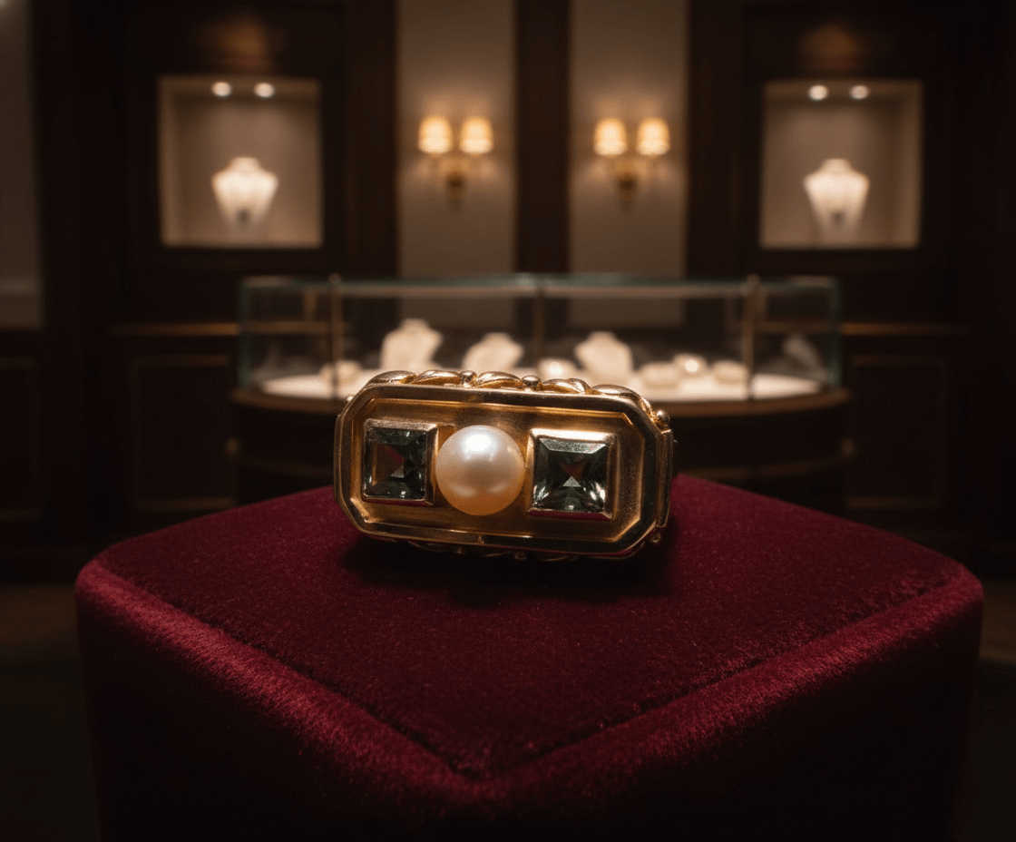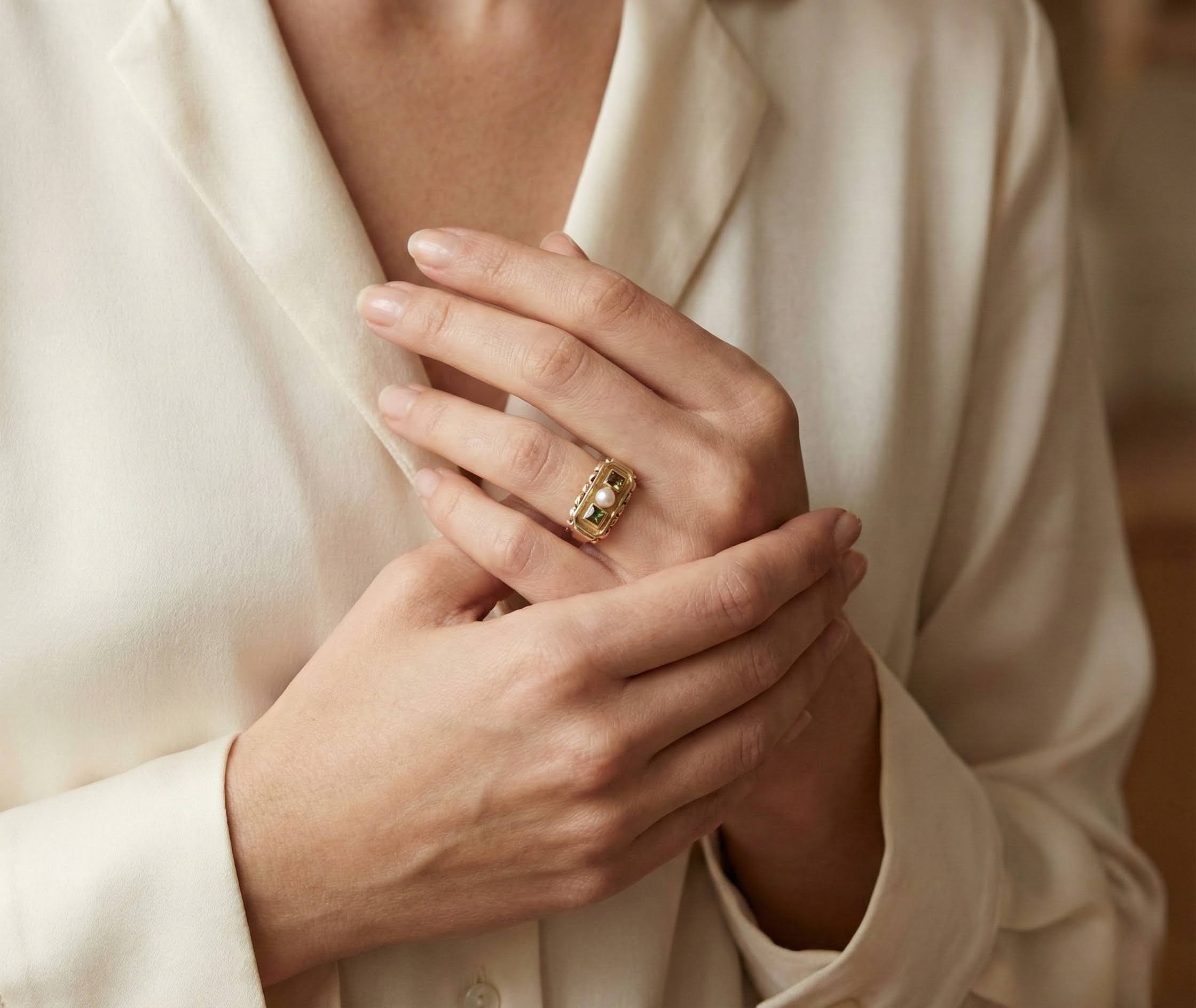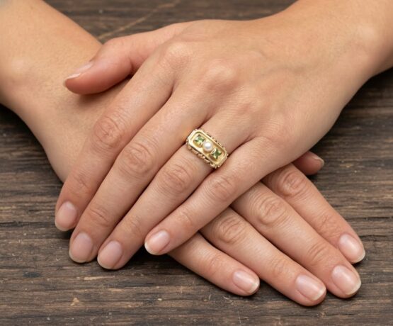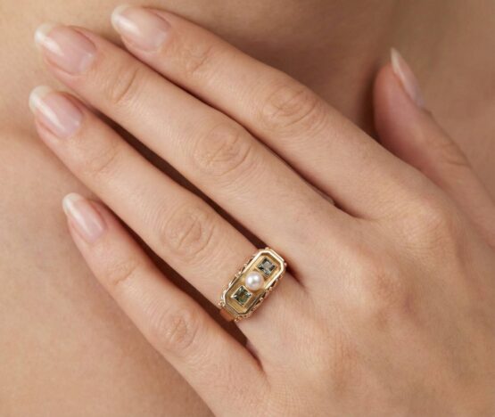 De geel gouden ring met parel en beryl is een prachtig sieraad om te dragen. Deze ring heeft een uniek ontwerp dat direct in het oog springt.