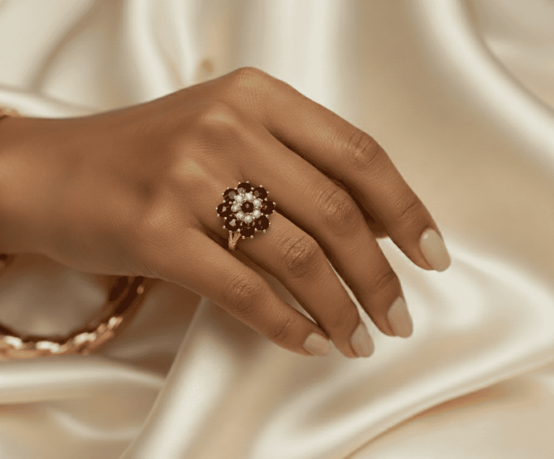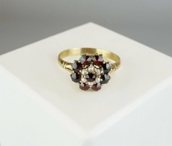 Deze gouden Christian ring met parel en granaat is een prachtig sieraad om te dragen.