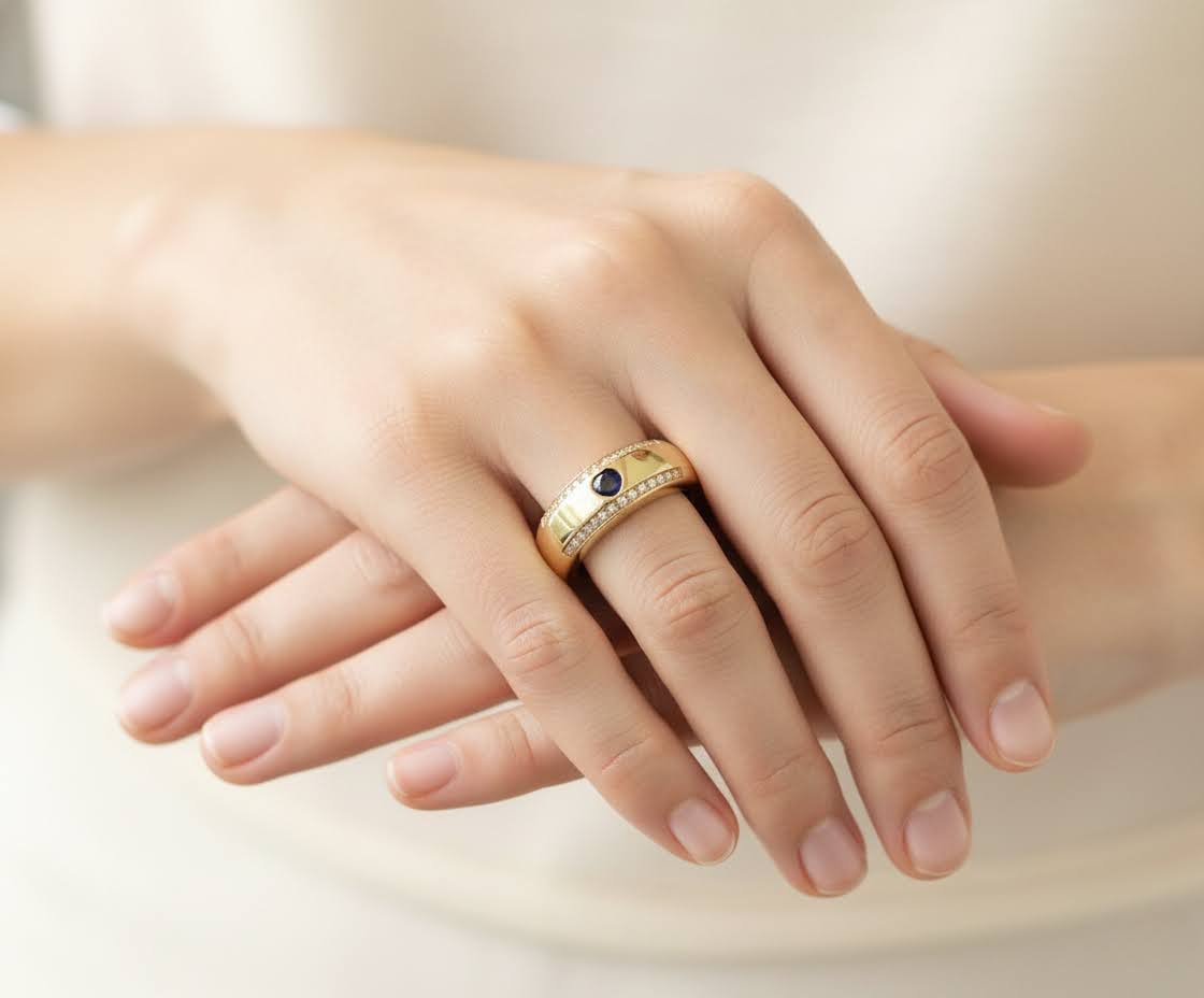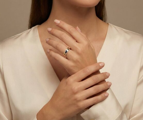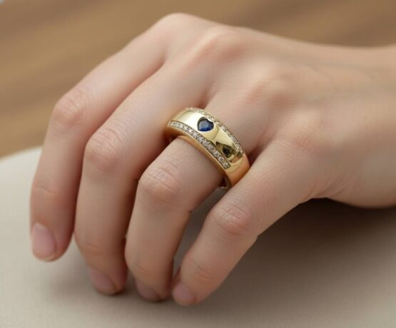 Gouden harten ring met diamanten en saffieren