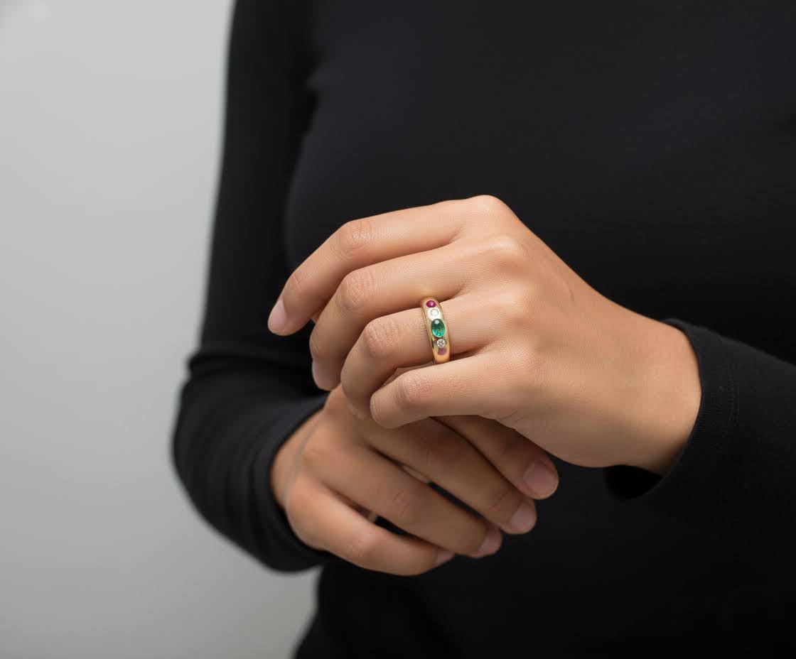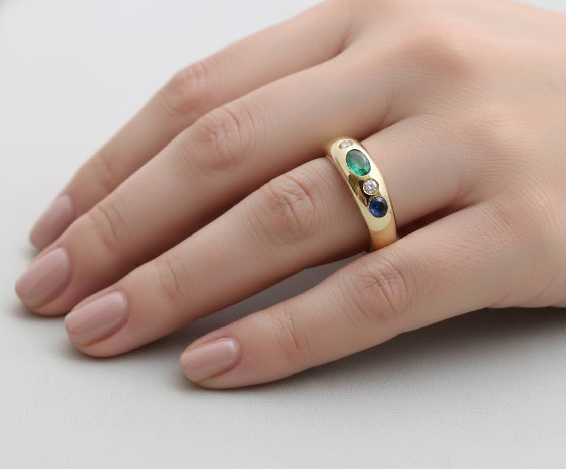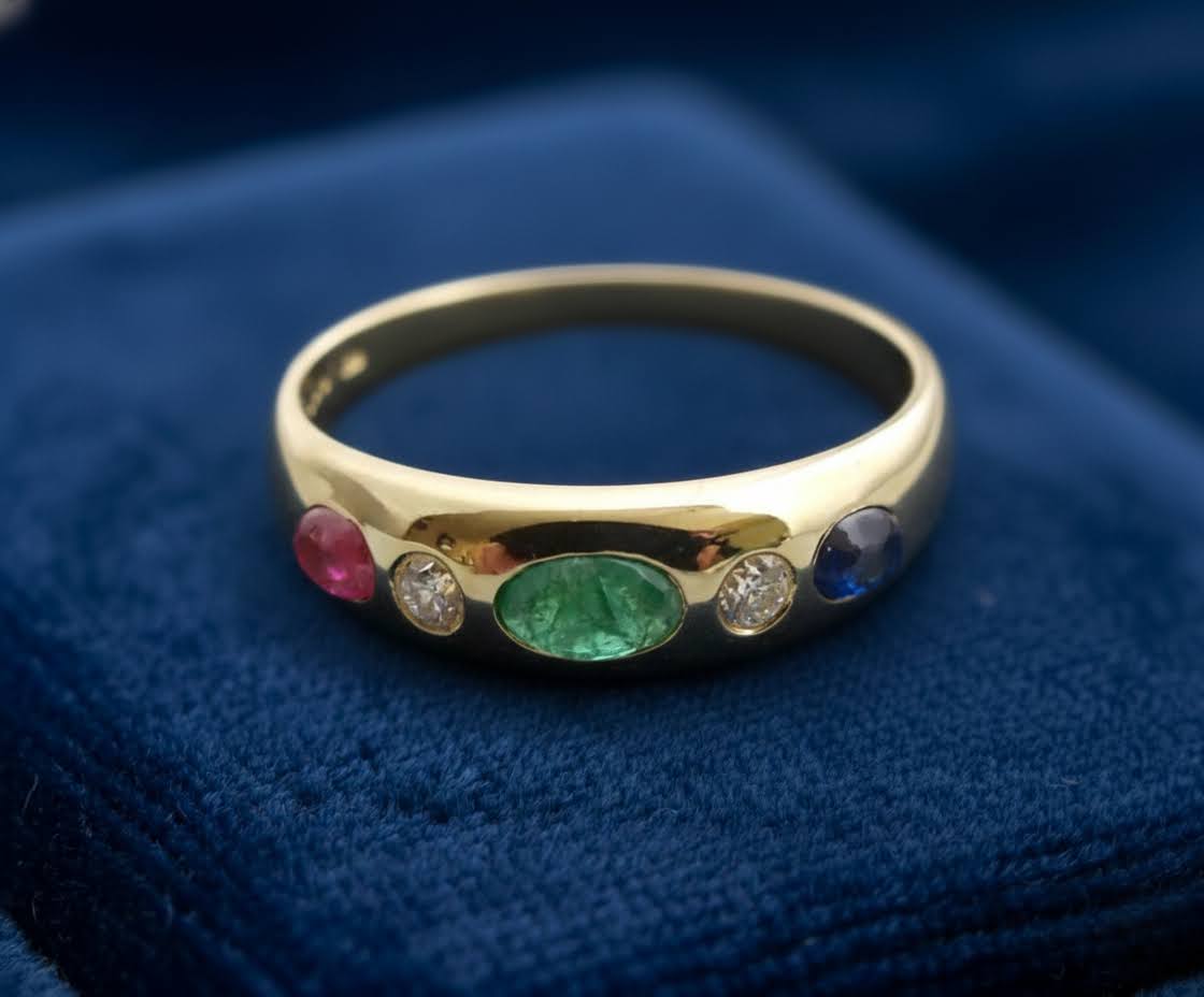 Gouden ring met briljant, smaragd, robijn en saffier