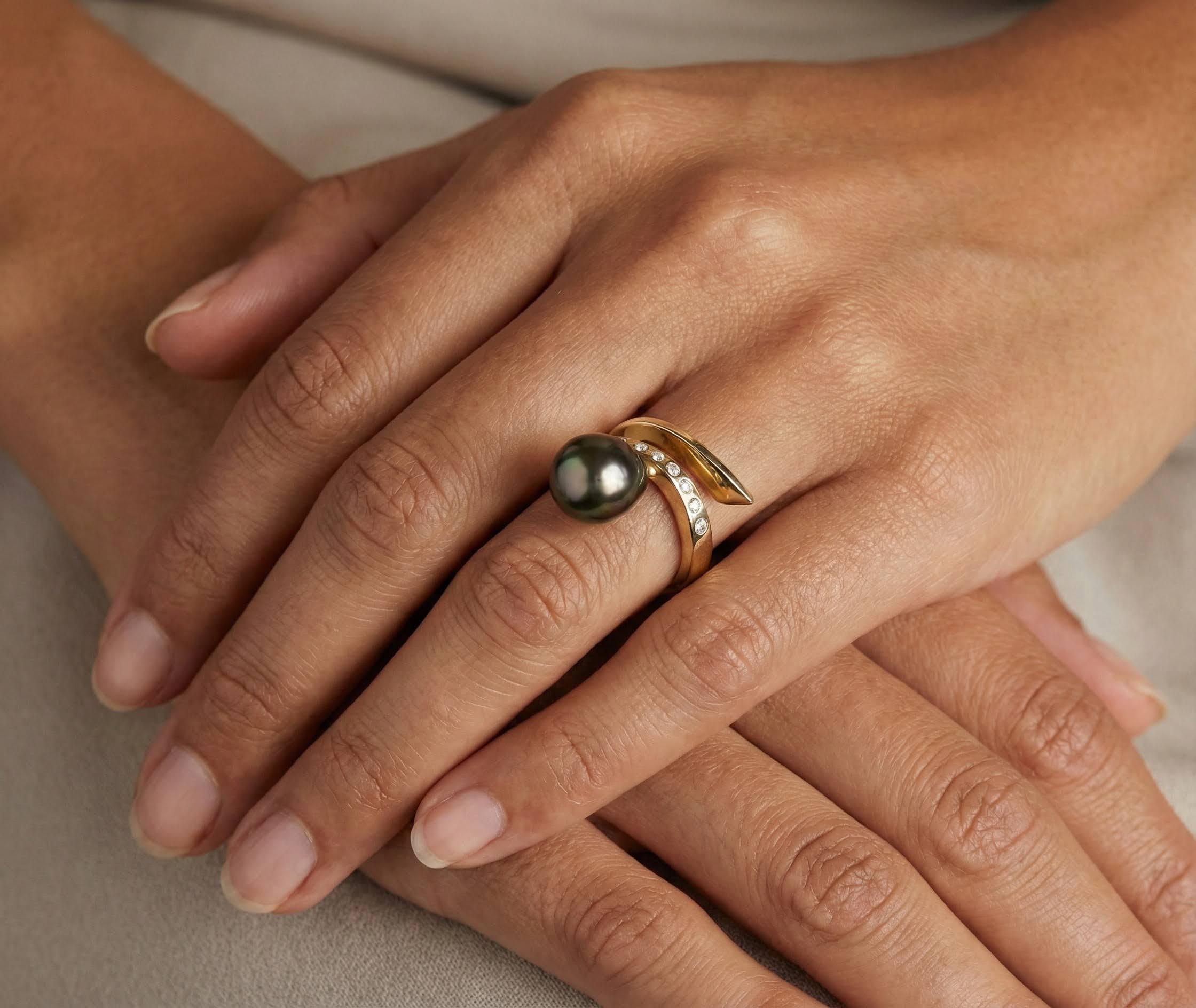 Deze gouden ring met diamant en akoya parel is een prachtig sieraad om te dragen.