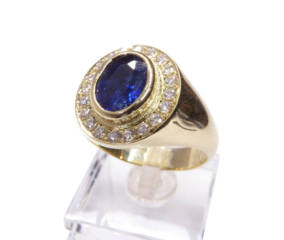 This gold ring with sapphire and diamonds is a beautiful piece of jewelry.