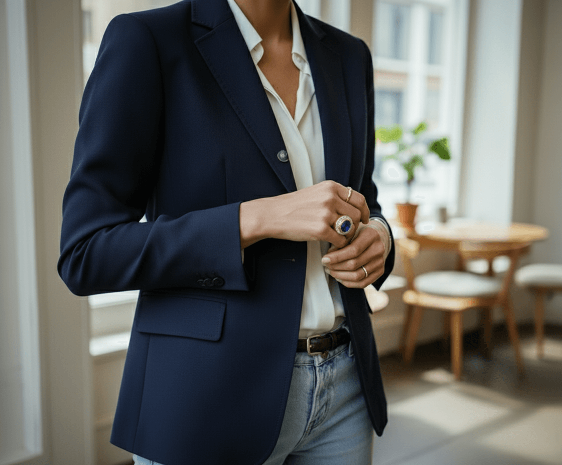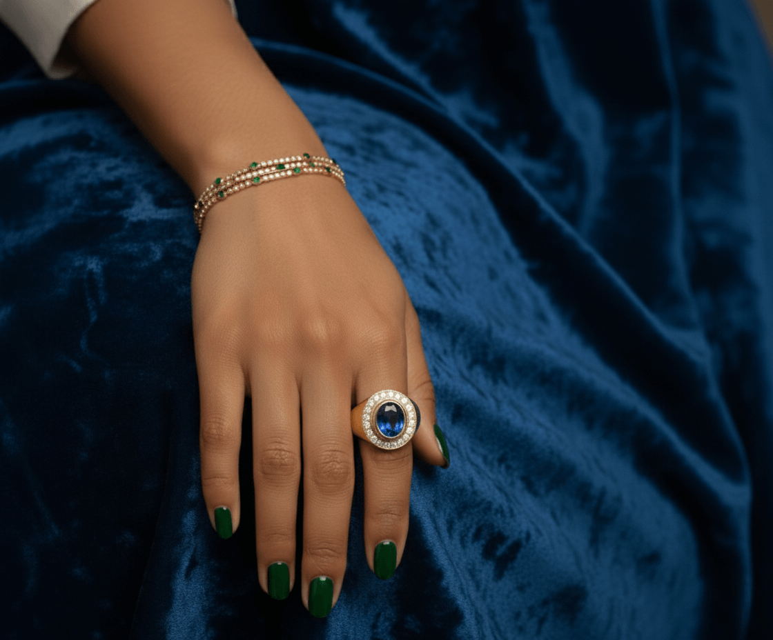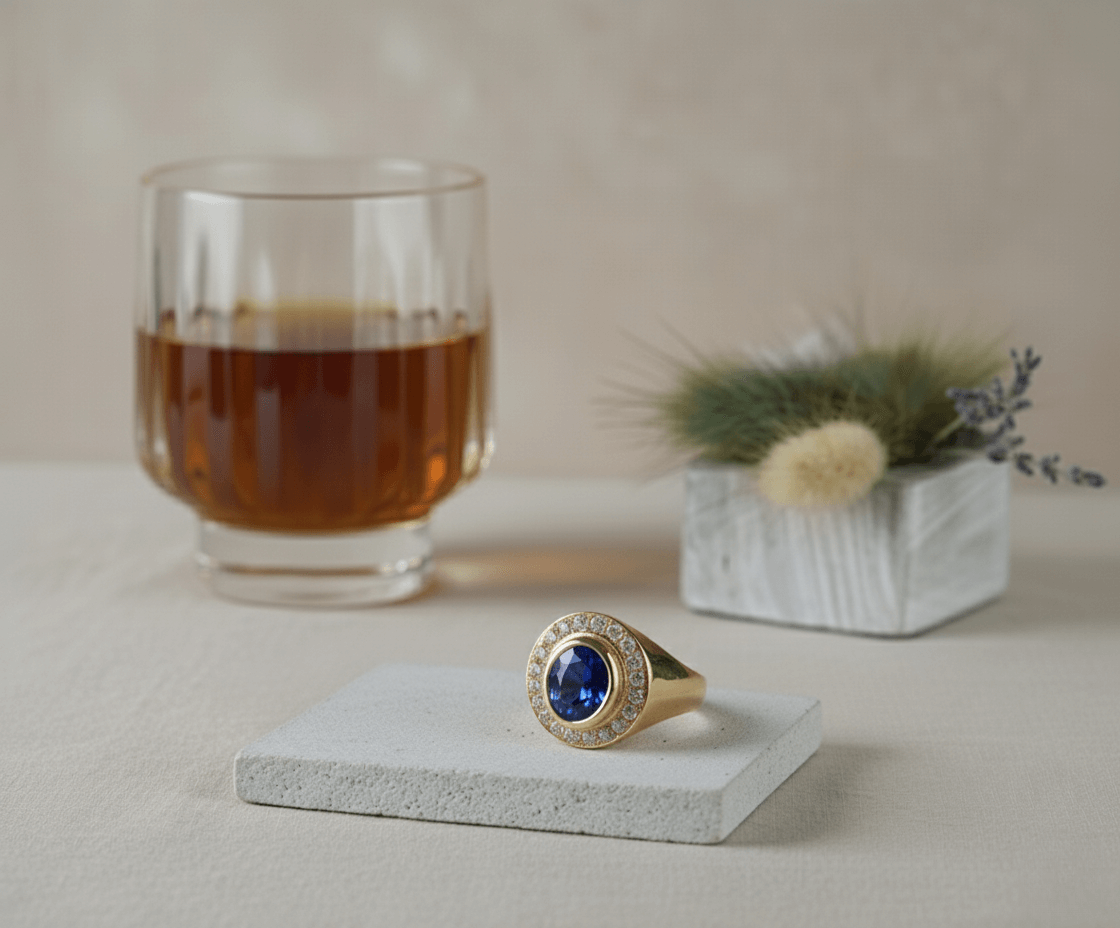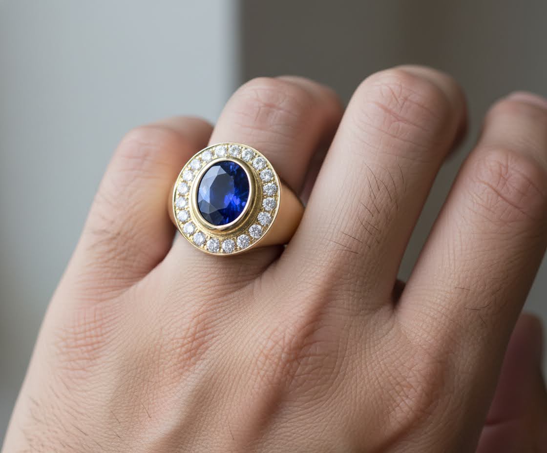 This gold ring with sapphire and diamonds is a beautiful piece of jewelry.