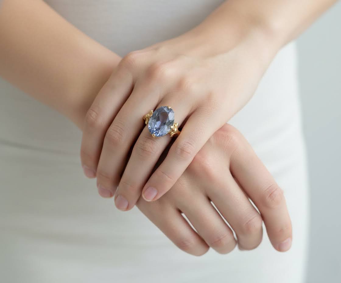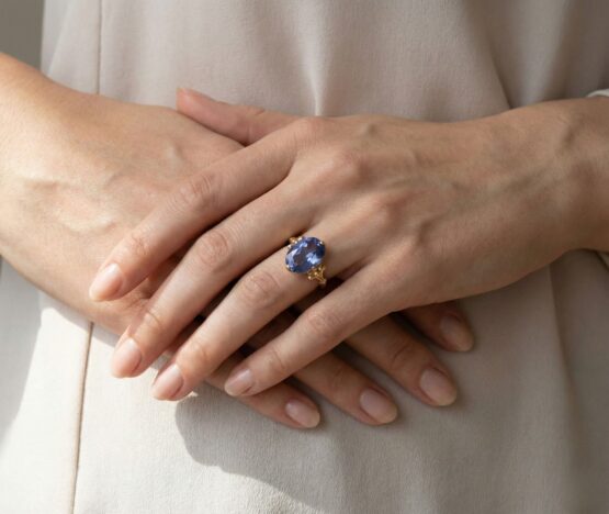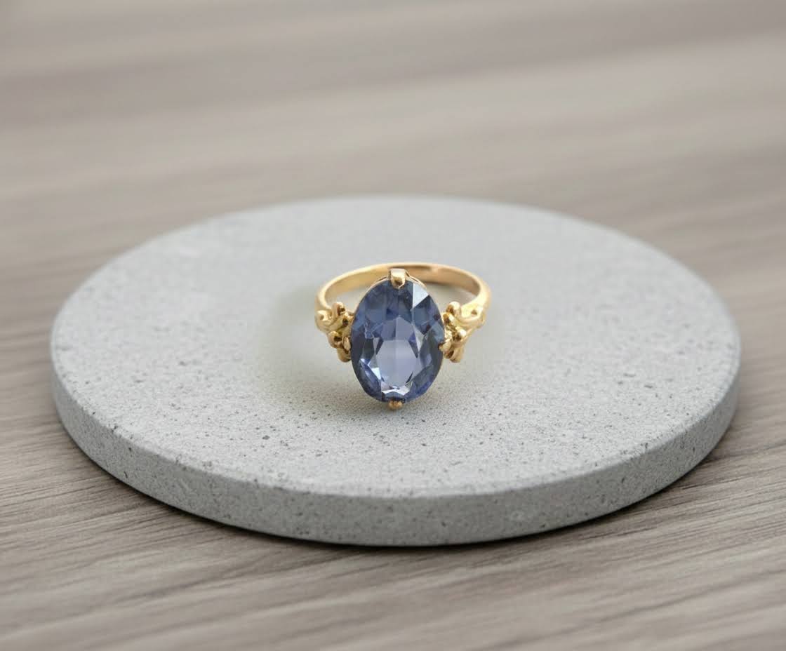 De gouden ring met synthetische topaas is een prachtig sieraad om te dragen. Deze ring heeft een uniek ontwerp dat direct in het oog springt.