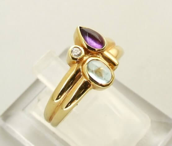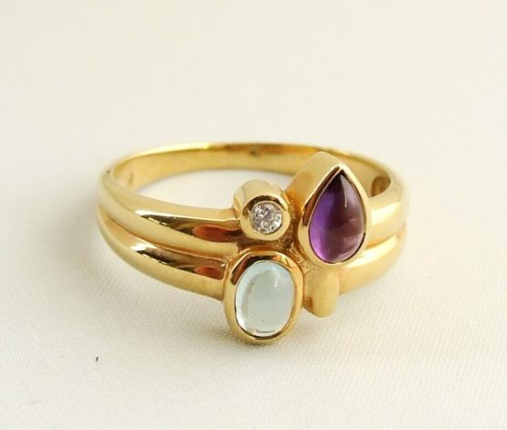 De gouden ring met topaas, amethist en briljant is een prachtig sieraad om te dragen.