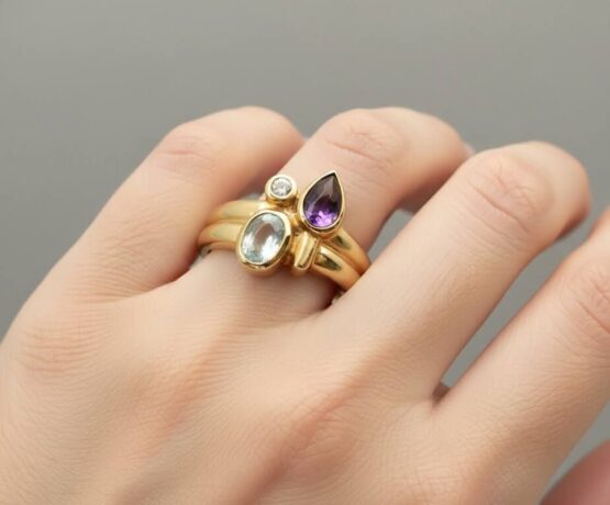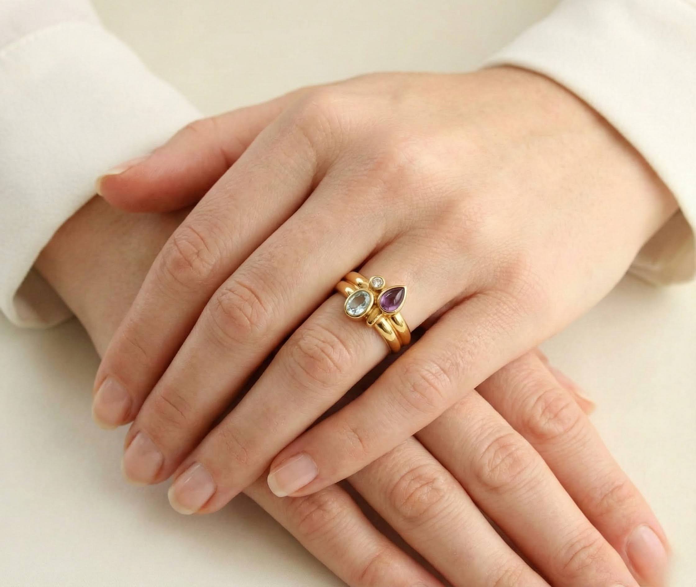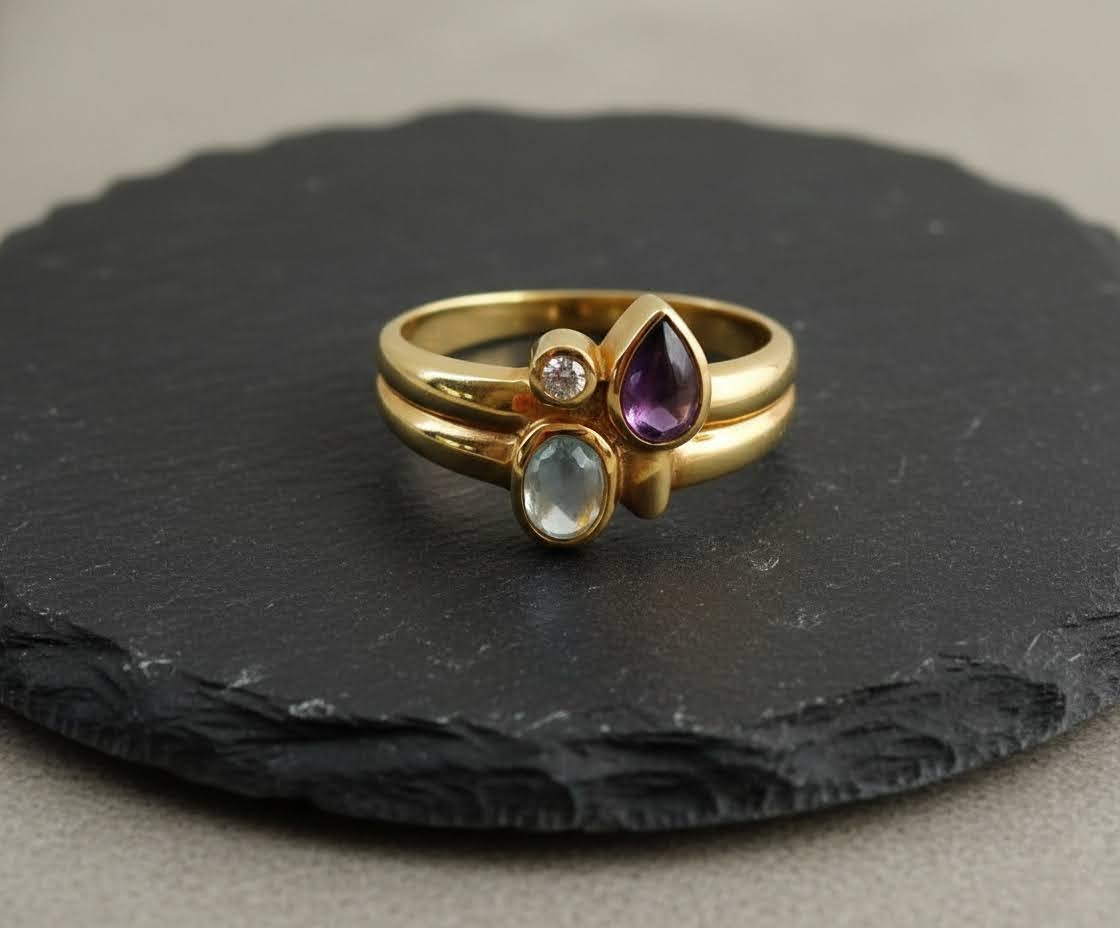 De gouden ring met topaas, amethist en briljant is een prachtig sieraad om te dragen.
