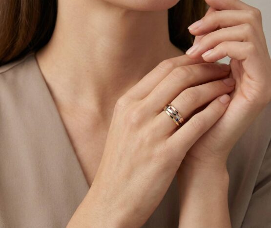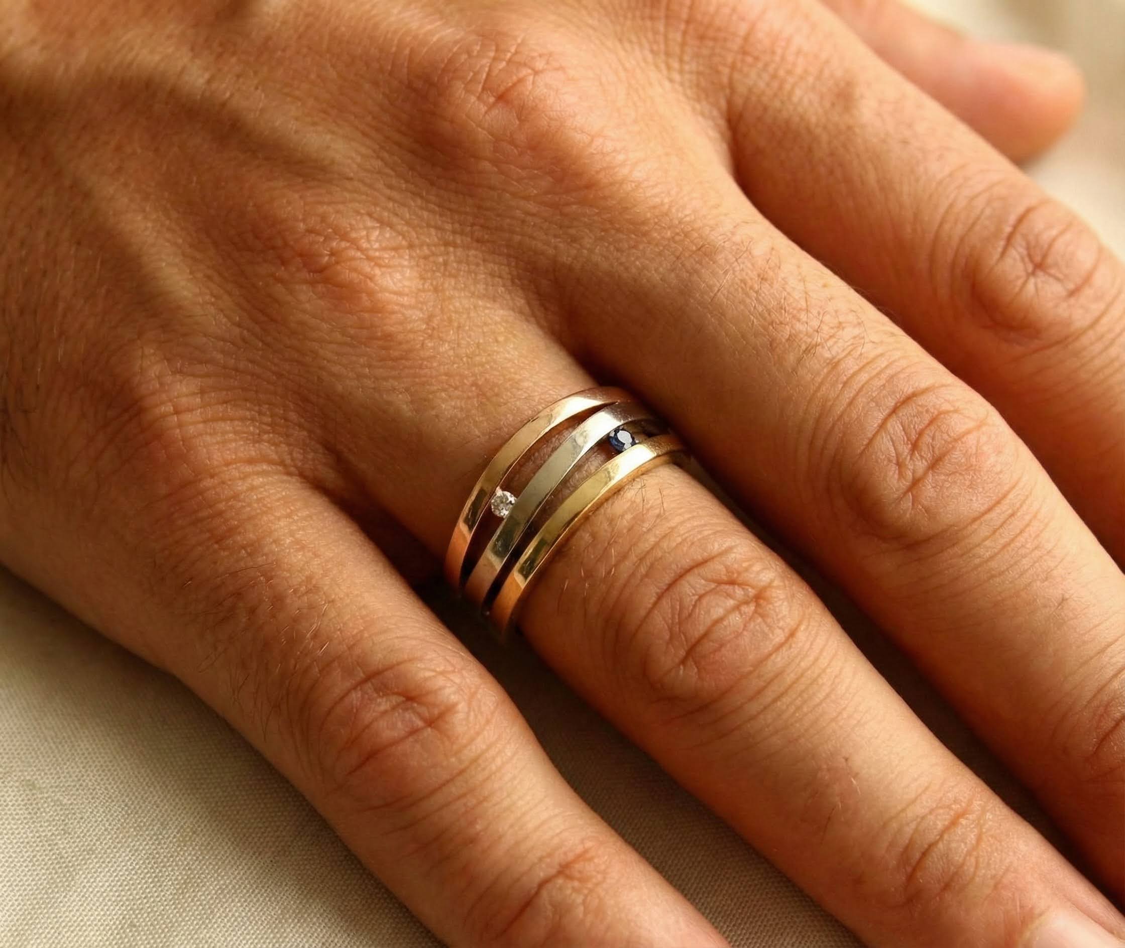 De gouden tricolor ring met diamant en saffier is een prachtig sieraad om te dragen.