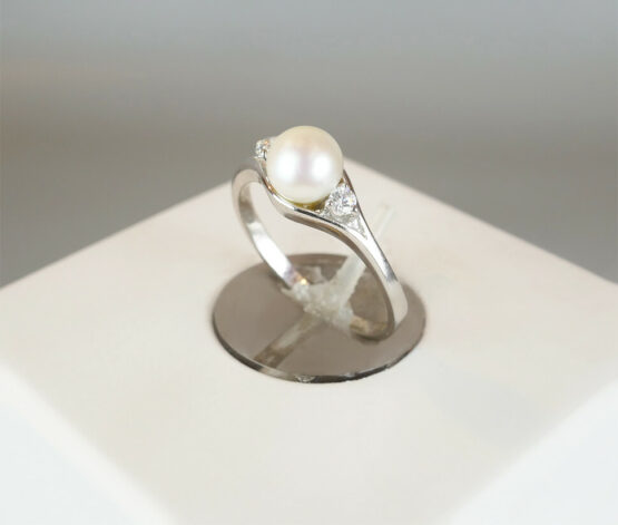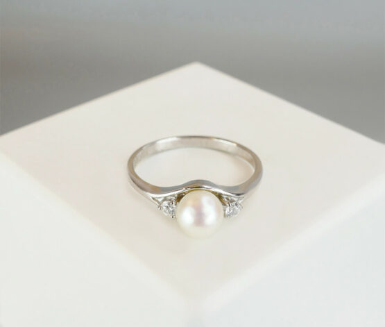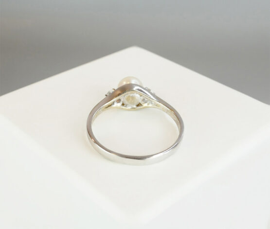 Deze wit gouden ring met parel en 2 diamanten is een prachtig sieraad om te dragen.
