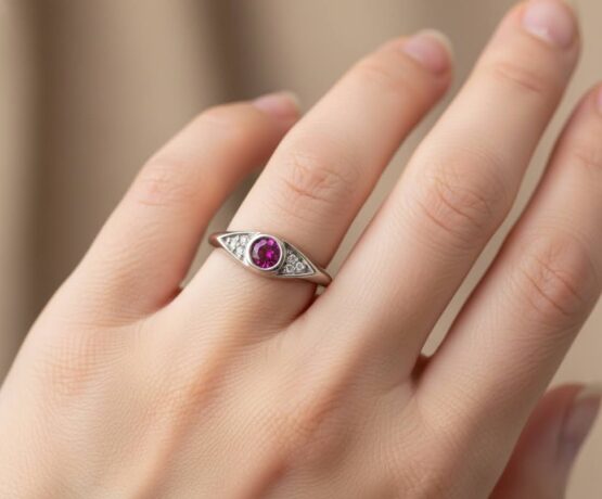 Deze nieuwe wit gouden ring met robijn en diamanten is een prachtig sieraad dat direct in het oog springt.