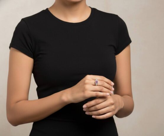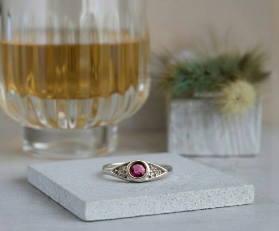 Schitter vandaag en draag deze wit gouden ring met robijn en diamanten.