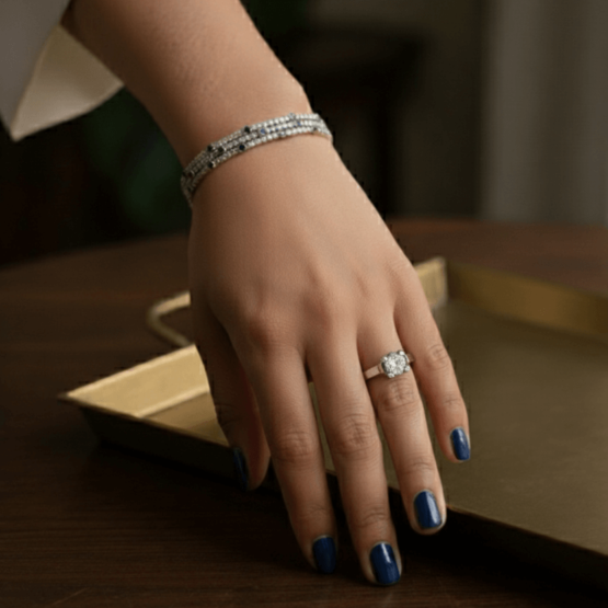 The white gold ring with solitaire brilliant was made by the goldsmith of Atelier Christian.