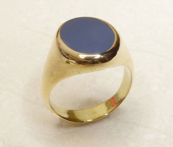 Lagensteen is de in de edelsteen-snijkunst gebruikte gelaagde materiaal. Een lagensteen wordt gesneden uit agaat. Agaat is een gestreepte halfedelsteen en een variëteit van het mineraal kwarts. Er zijn veel verschillende soorten kleuren, patronen en structuren lagensteen. De ring heeft een mooie licht- tot donkerblauwe kleur. Wilt u een gravure in uw lagensteen ring? De Goudsmid van Atelier Christian heeft jarenlange ervaring in gravure. Onze vakmanschap staan garant voor de hoge kwaliteit van het persoonlijke eindresultaat van uw lagensteen ring.