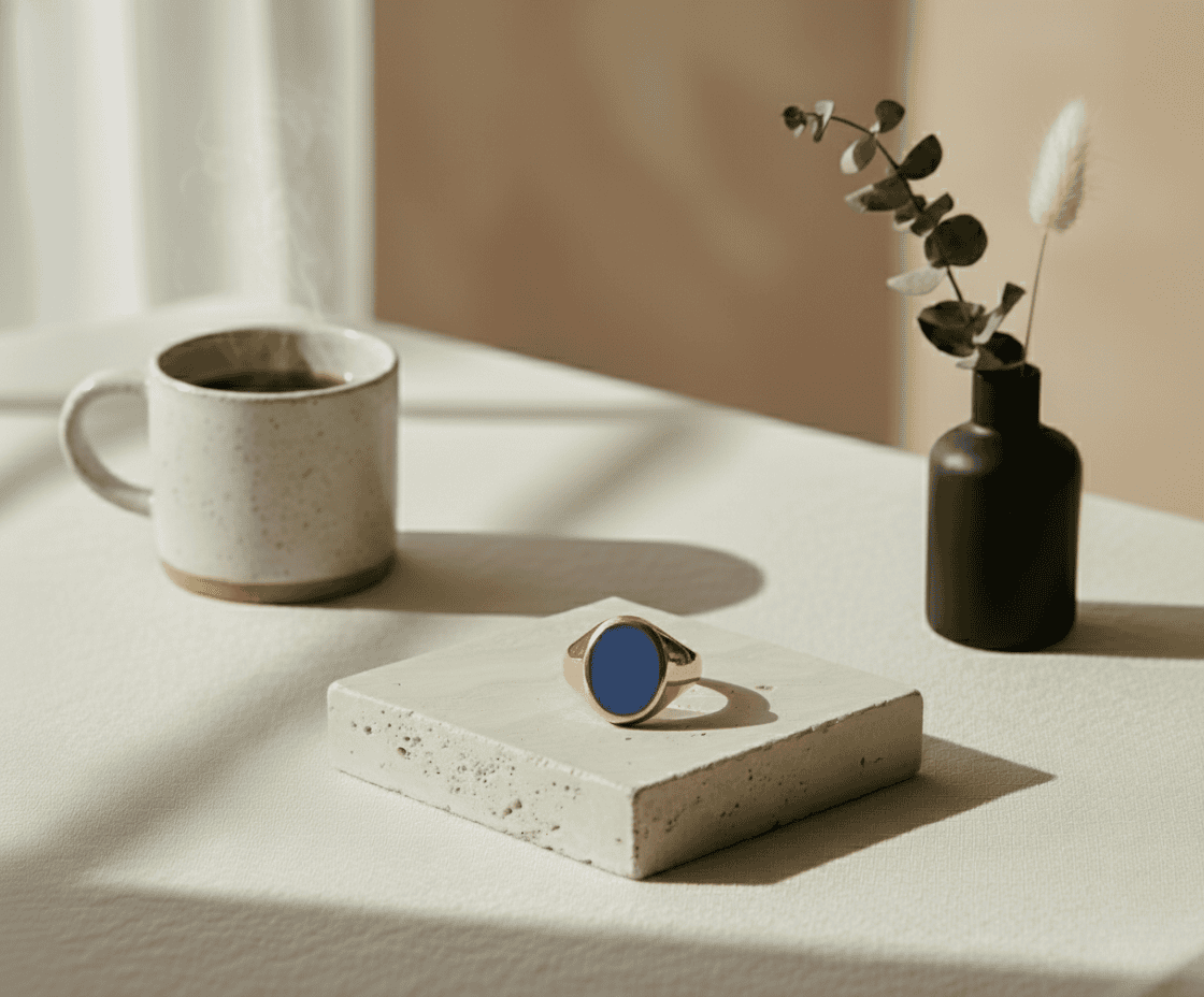 Lagensteen is de in de edelsteen-snijkunst gebruikte gelaagde materiaal. Een lagensteen wordt gesneden uit agaat. Agaat is een gestreepte halfedelsteen en een variëteit van het mineraal kwarts. Er zijn veel verschillende soorten kleuren, patronen en structuren lagensteen. De ring heeft een mooie licht- tot donkerblauwe kleur. Wilt u een gravure in uw lagensteen ring? De Goudsmid van Atelier Christian heeft jarenlange ervaring in gravure. Onze vakmanschap staan garant voor de hoge kwaliteit van het persoonlijke eindresultaat van uw lagensteen ring.