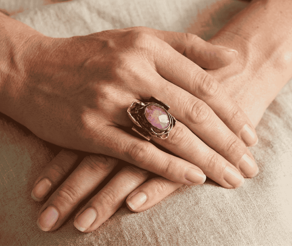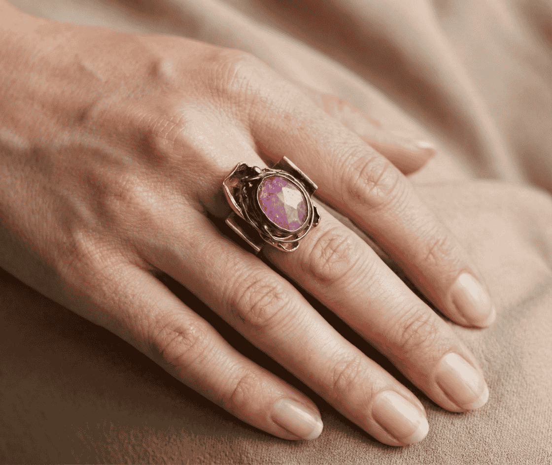 Deze zilveren ring met kunziet is een prachtig en uniek sieraad.