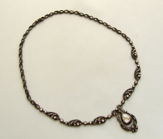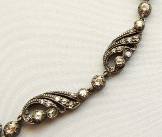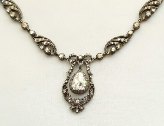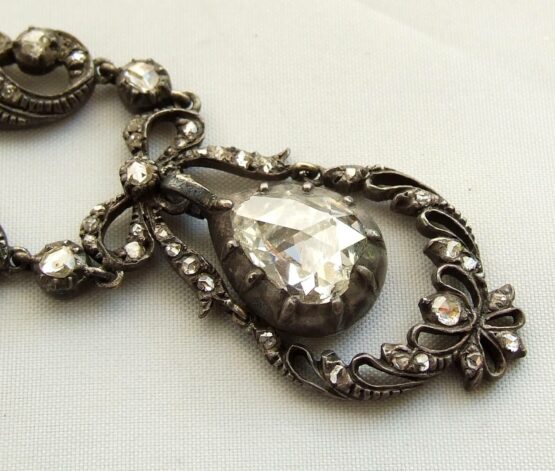 Deze antieke roosdiamanten set is een familiestuk. De roosdiamant aan de collier is het toonbeeld van een siersteen: een prachtig juweel om rond uw hals te dragen. Roosdiamant is zeldzaam omdat het tegenwoordig bijna niet meer wordt vervaardigd en gebruikt. Diamant is bijzonder omdat het licht schitterend splitst in de spectraalkleuren (kleuren van de regenboog). Zo ontstaat een prachtig kleurenspel dat, als sprankelende vuur, met het licht speelt. Diamant is onvergelijkbaar en voor altijd mooi.